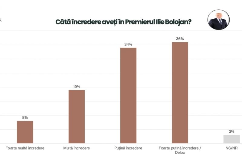 Nici premierul Ilie Bolojan nu beneficiază de încredere din partea populației. Abia 8% dintre români apreciază performanțele sale ca șef al Guvernului, în timp ce 36% dintre români consideră că președintele interimar al PNL nu este un politician în care să aibă încredere.