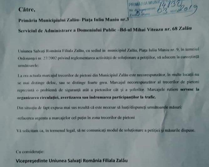 Uniunea Salvați România (USR) - Filiala Zalău a depus la Primăria Municipiului Zalău o petiție privind starea necorespunzătoare a marcajelor trecerilor de pietoni.