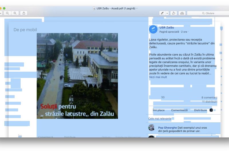 la proiectarea, execuția și recepția lucrărilor de reabilitare a străzilor se are în vedere și drenajul apelor. Așteptăm răspunsul și soluțiile Primăriei Zalau și ale autorităților locale. O administraţie publică locală modernă și competitivă trebuie să aibă proiecte și soluții la aceste probleme. Mai ales în condițiile în care se pare că aceste fenomene meteorologice vor fi din ce în ce mai prezente", este mesajul transmis de Filiala Zalău a Uniunii Salvați România. Soluțiile propuse de formațiunea politică sunt canalizare eficientă, drenajul străzilor și rigole pe fiecare stradă.Și cum răspunsurile nu se lasă așteptate, la scurt timp de la postarea mesajului a apărut și o primă "soluție": " Dati exemplul unui oras din țară gospodărit de primar usr". (Pop Gheorghe, senator PSD, Sălaj).