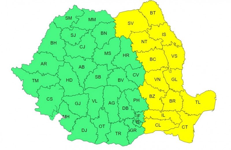 De asemenea, meteorologii au emis o atenţionare cod galben, valabilă pentru intervalul 7 ianuarie, ora 18 – 9 ianuarie, ora 10, când sunt anunţate intensificări ale vântului, polei, ninsori moderate cantitativ şi viscol în Moldova, Dobrogea şi jumătatea de est a Munteniei.
