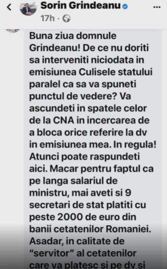 La scurt timp după ce Anca Alexandrescu a relatat ce s-a întâmplat cu mesajele pe care i le-a adresat ministrului Transporturilor, urmăritorii emisiunii "Culisele Statului Paralel" au început să posteze și ei mesaje în care îi cer lui Sorin Grindeanu să răspundă. Zeci de astfel de interpelări au apărut pe pagina ministrului.