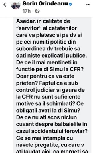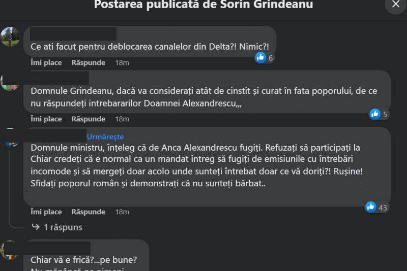 Pagina de Facebook a lui Sorin Grindeanu a fost asaltată de telespectatori ai emisiunii "Culisele Statului ", după ce ministrul Transporturilor sau administratorii profilului său au șters un mesaj în care Anca Alexandrescu i-a cerut să răspundă concret unor întrebări legate de modul în care administrează ministerul, dar și despre situația unor companii din subordine, cum ar fi CFR.