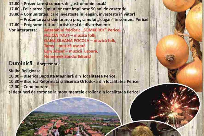 Comuna Pericei găzduieşte, la acest final de săptămână, în perioada 7-8 septembrie, Festivalul Cepei. Evenimentul, aflat la a XII-a ediţie, este organizat de Consiliul Local al comunei Pericei și Primăria Pericei, Centrul de Informare și Marketing Turistic Pericei, Centrul de Cultură și Artă al județului Sălaj, Asociaţia Culturală Maghiară din Canada, Uniunea Democrată a Maghiarilor -(UDMR) organizaţia Pericei şi Școala Gimnazială Nr. 1 din localitate. Evenimentul va debuta sâmbătă - 7 septembrie, începând cu ora 12, cu o conferinţă pe tema ''Viziunea agroturismului în judeţul Sălaj'', urmată de un concurs de gastronomie locală. Din programul zilei de sâmbătă nu vor lipsi: felicitarea de către administraţia locală a tuturor cuplurilor din comună care în acest an împlinesc sau urmează să împlinească 50 de ani de căsătorie, prezentarea şi demararea programului ''Leagăn'' în comuna Pericei, dar şi programe artistice şi de divertisment cu: Ansamblul Folcloric ''Somkerek'' Pericei, Felicia Tout - muzică folk, Oana Silvana Pocola - muzică folk, Tomy - muzică uşoară, Egry Jozsef - muzică uşoară şi Homonik Sandor&Band. Programul va continua şi duminică - 8 septembrie, începând cu ora 10, cu slujbe religioase care se vor desfăşura la Biserica Baptistă Maghiară, la Biserica Reformată şi la Biserica Ortodoxă din Percei, dar şi cu depuneri de coroane la monumentele eroilor din localitate. Potrivit organizatorilor, Festivalul Cepei de la Pericei este un eveniment anual de amploare, cu siguranță, așteptat de locuitorii comunei, dar și de invitații acestora care sosesc din celelalte localități ale județului sau din țară. Festivalul se organizeză în fiecare an, la începutul lunii septembrie, la sfârșitul primei săptămâni. Ceapa a contribuit la făurirea renumelui comunei Pericei. Există documente care atestă folosirea cepei de Pericei și în bucătăria imperială din Viena. Ceapa este una din cele mai importante legume, fiind cunoscută în lumea întreagă, dar şi una din cele mai vechi plante de cultură. În cinstea acetei legume, dar și a localnicilor, a fost ridicată în anul 2007 statuia cepei. Totodată, începând cu 2007 se organizează în fiecare an Festivalul Cepei. Acesta reprezintă o oportunitate de manifestare a producătorilor locali și de promovare a brandului ''Ceapa de Pericei''. Producătorii locali au oportunitatea de a-și prezenta recoltele, calitatea produselor și preparatele culinare realizate din ceapă. Festivalul reprezintă o oportunitate pentru strângerea relaților de colaborare cu localitățile vecine și localitățile înfrățite din afara ţării. Festivalul Cepei amintește locuitorilor de intrarea în ''Cartea Recordurilor'' cu cea mai lungă cunună de ceapă, eveniment care a avut loc în anul 2007.