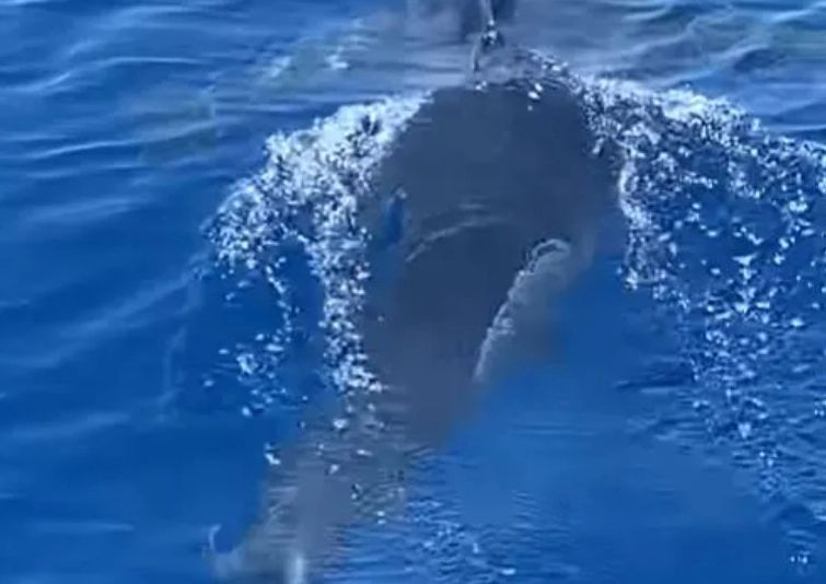 Corpul masiv al animalului, asemănător unui rezervor, a putut fi văzut navigând prin apa limpede, cu aripioarele sale mici care despica suprafața.