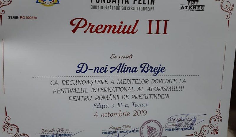 La cea de a III-a ediţie a Festivalul Internaţional al Aforismului pentru românii de pretutindeni, sălăjeanca Alina Breje a obținut premiul III ca recunoaștere a meritelor dovedite la Festival. Evenimentul s-a desfășurat la Tecuci, în perioada 3-4 octombrie, în organizarea şi coordonarea scriitorului Vasile Ghica, sub patronajul Fundaţiei ''Pelin'' condusă de Eugen Doru Pelin. În cadrul festivalului s-au desfăşurat întâlniri în şcoli, unde elevii au susţinut dezbateri despre aforism și au organizat activităţi demonstrative, iar apoi au urmat apoi la Ateneu lansări de cărți, recitaluri de aforisme şi colocvii cu participarea unor scriitori cunoscuţi. Printre participanți s-au numărat nume cunoscute ale aforisticii actuale. Evenimentul cultural s-a încheiat cu Gala de premiere, iar pe lista premianților s-a aflat și Alina Breje, scriitor şi traducător, care a câștigat premiul III, ca recunoaștere a meritelor dovedite la Festival.