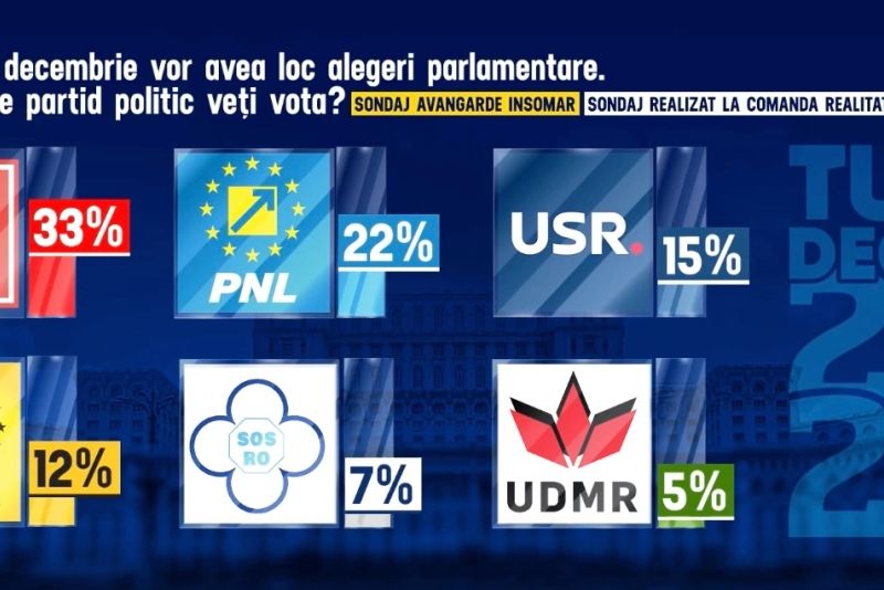 În ceea ce privește intențiile de vot la alegerile parlamentare din 1 decembrie, datele aceluiași sondaj Avangarde INSOMAR arată că românii ar vota astfel:
