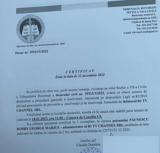 „Se certifică de către noi, grefa acestei instanţe, existenţa pe rolul Secției a VII-a Civile a Tribunalului Bucureşti a dosarului civil nr. 35923/3/2022, având ca obiect cererea de deschidere a procedurii generale a insolvenței, întemeiată pe dispozițiile Legii nr.85/2014 privind procedurile de prevenire a insolvenţei şi de insolvență, formulată de debitorul B1 TV CHANNEL SRL. Verificând actele şi lucrările dosarului, rezultă că în cauză este stabilit prim termen de judecată la 18.01.2023, ora 11.00- Camera de Consiliu C5. S-a eliberat prezentul certificat în 3 exemplare, la cererea petentului PĂUNESCU BOBBY GEORGE MARIUS - administrator al B1 TV CHANNEL SRL, anulându-se taxa judiciară de timbru în valoare de 2 lei, achitată cu chitanța nr. 125751/21.12.2022”, se arată în document.