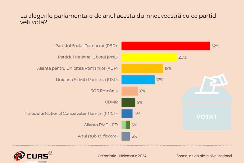 Conform sondajului CURS, PSD ar obține 32% și ar câștiga detașat alegerile parlamentare.